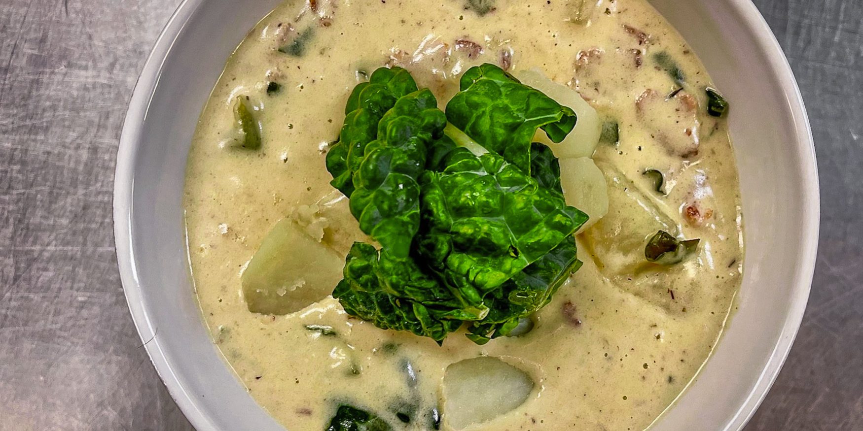 While the potatoes are cooking, cook the bacon and onions in a large pot. Sautee for about 10minutes and drain the mixture. Add the bacon and onions back to the pot along with the kale. Sautee for another 5 minutes. Season with salt and pepper and add in the butter and flour. Stir until smooth and slowly add in the cream and stock. Stir often and bring to a simmer, stirring up the bottom. Add herbs and the potatoes and check to taste if you want more salt.