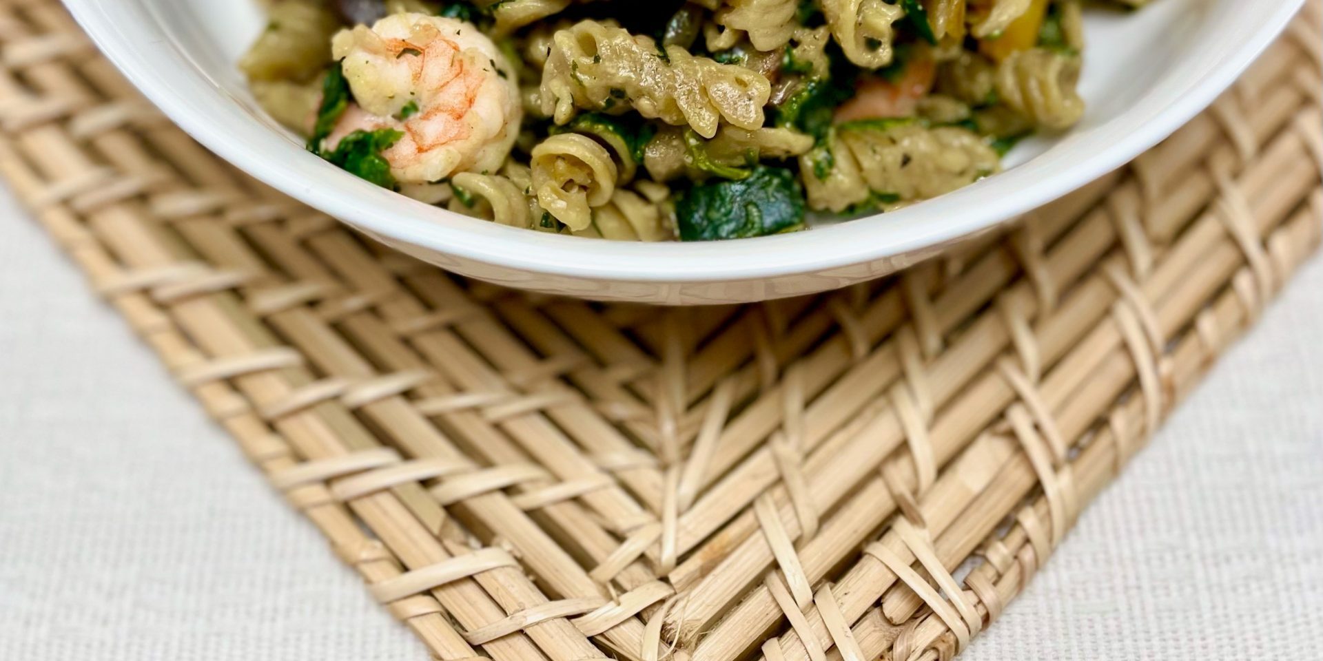 Thaw and drain the shrimp. Heat the oil in a large skillet and add in the veggies, pasta and shrimp. Season with salt and pepper. Stir often over medium high heat until the shrimp is pink, about 15 minutes.